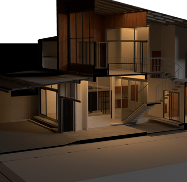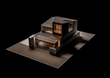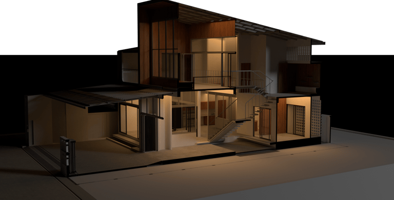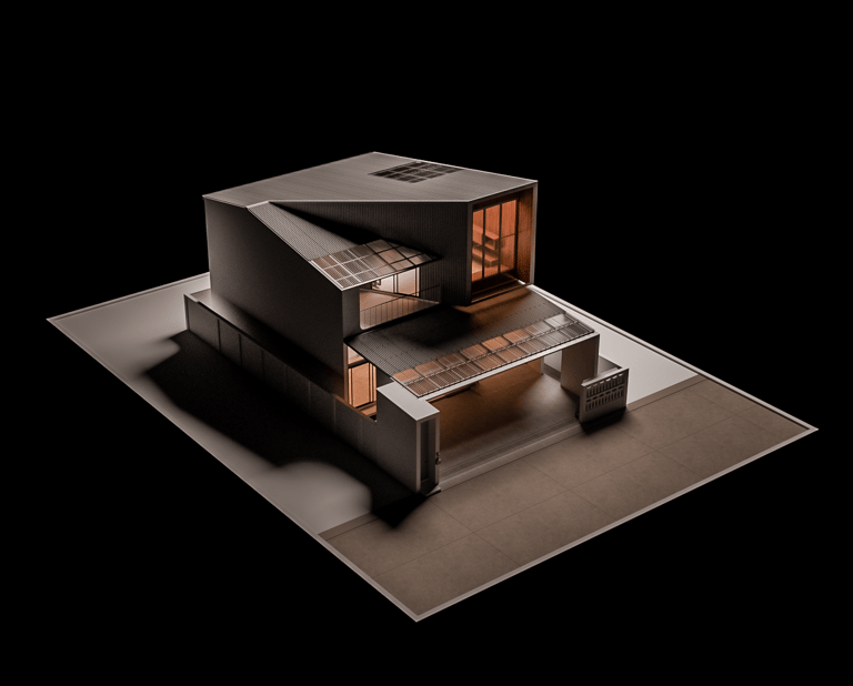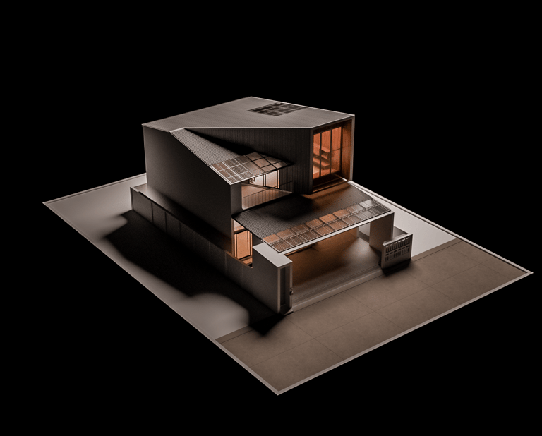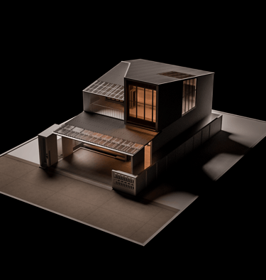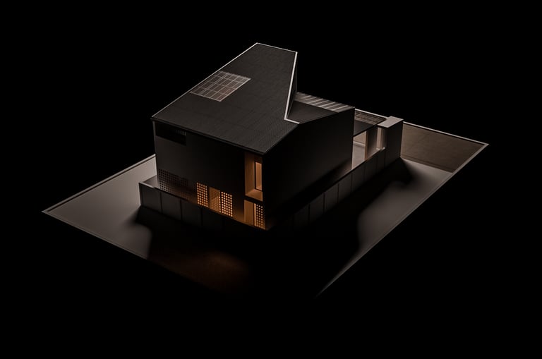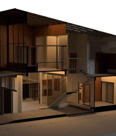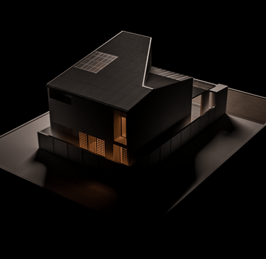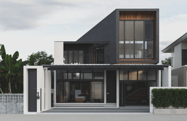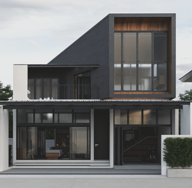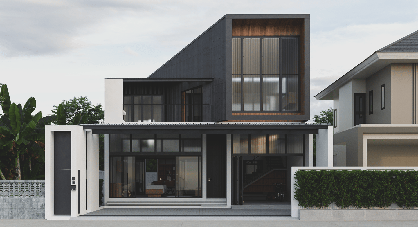 This design focuses on urban integration, prioritizing privacy by enclosing the house due to lack of desirable views. A central double-space area enhances light and openness,creating a warehouse-like feel with spaciousness and good ventilation. The exterior features dark black metal sheets paired with wood elements for balance, while slanted walls and curved lines add a modern yet soft aesthetic. A special thanks is extended to Khun Suporn for the opportunity to share this project.