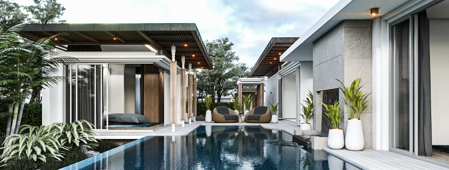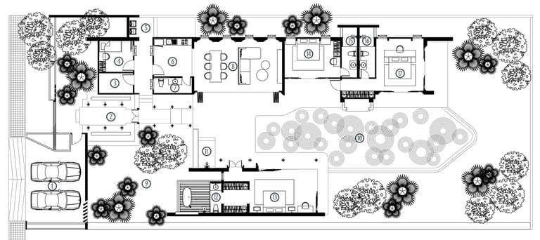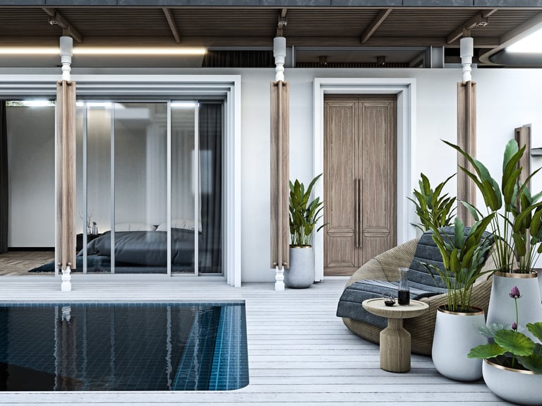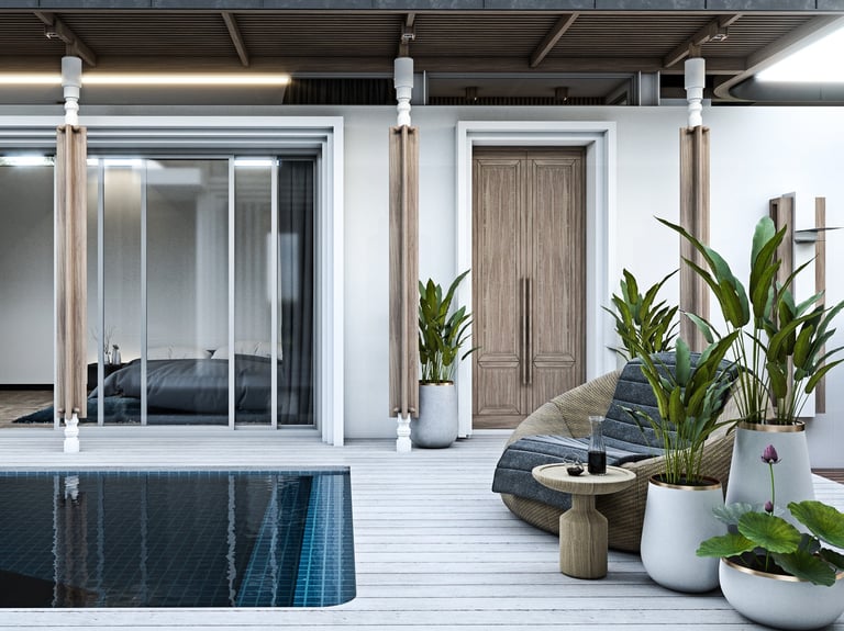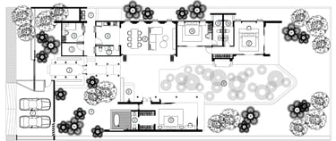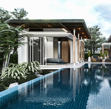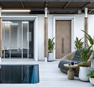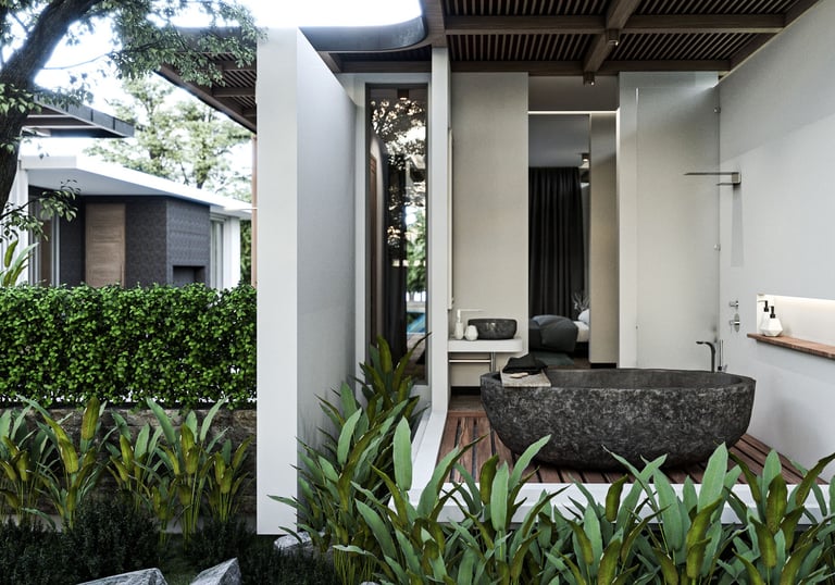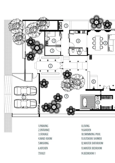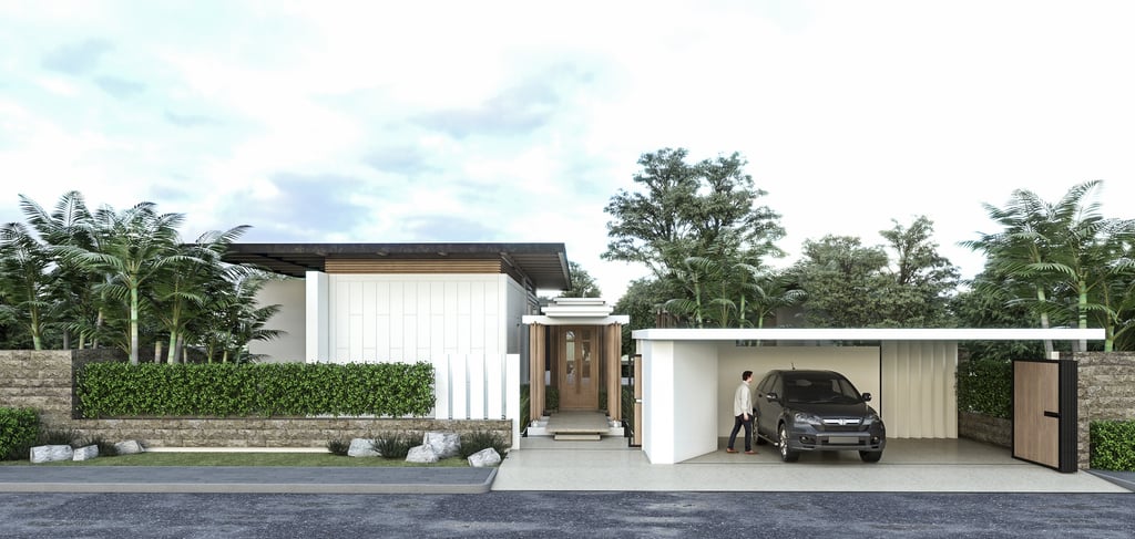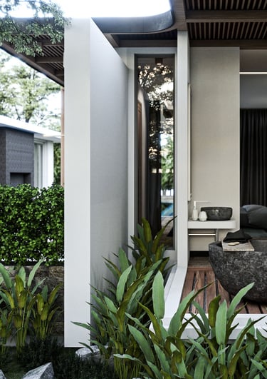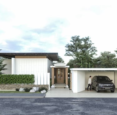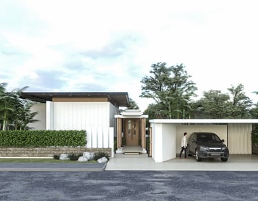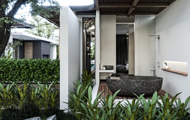 This house is designed with an open central space, allowing the structure to remain thin and well-ventilated. The middle area, a private retreat, is flanked by open spaces, and the extended eaves provide excellent protection from sun and rain. The design features a personal touch, blending modern tropical elements with the warmth of wood and a clean, refreshing aesthetic.