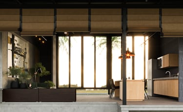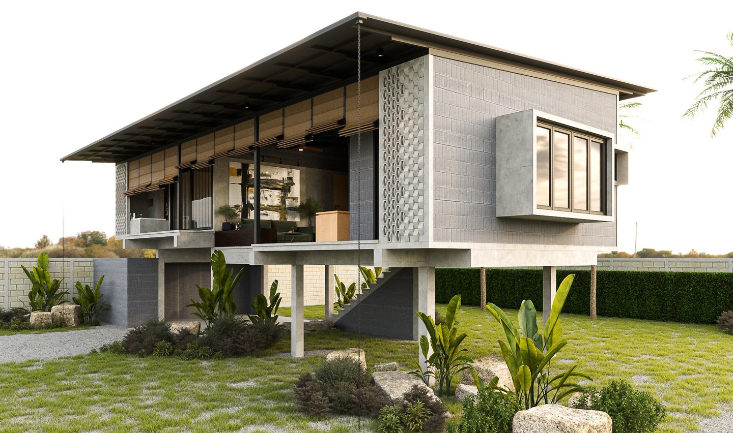 This house is thoughtfully designed to suit the tropical climate, with a layout that maximizes comfort and efficiency. The building is oriented lengthwise across the path of the sun, minimizing direct sunlight into the house. By facing the front of the house to the north, it captures breezes from both the north and south, ensuring good ventilation. The raised foundation, inspired by traditional local homes, helps the house catch cooler breezes from above, reduces heat accumulation, and prevents dust from entering.