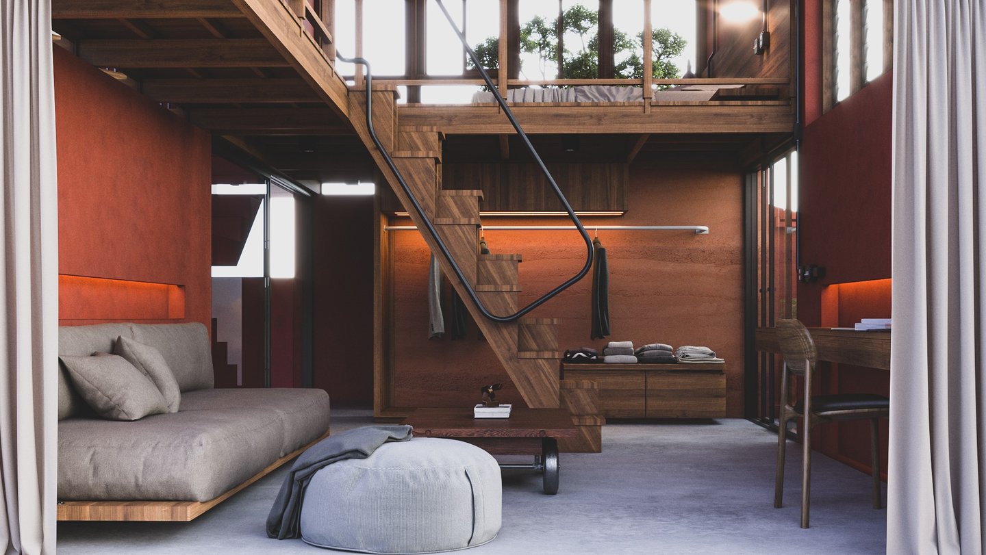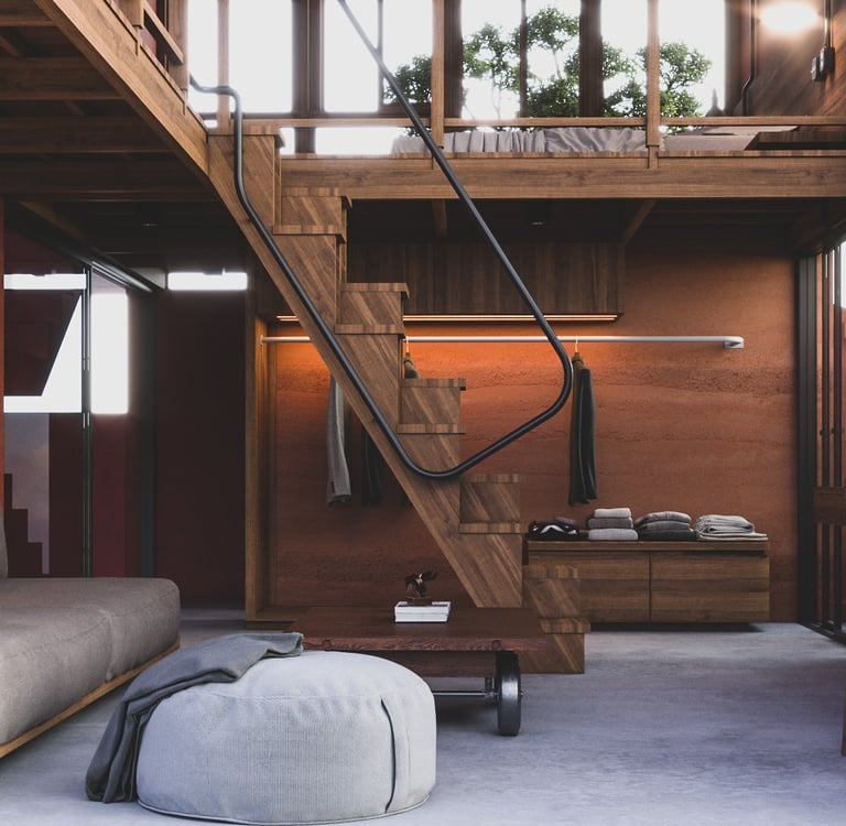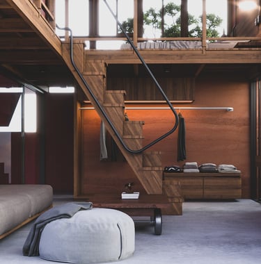 A thoughtfully designed split-level home that maximizes interior space efficiency while seamlessly integrating natural elements to compensate for any lost areas, creating a harmonious connection with the environment.