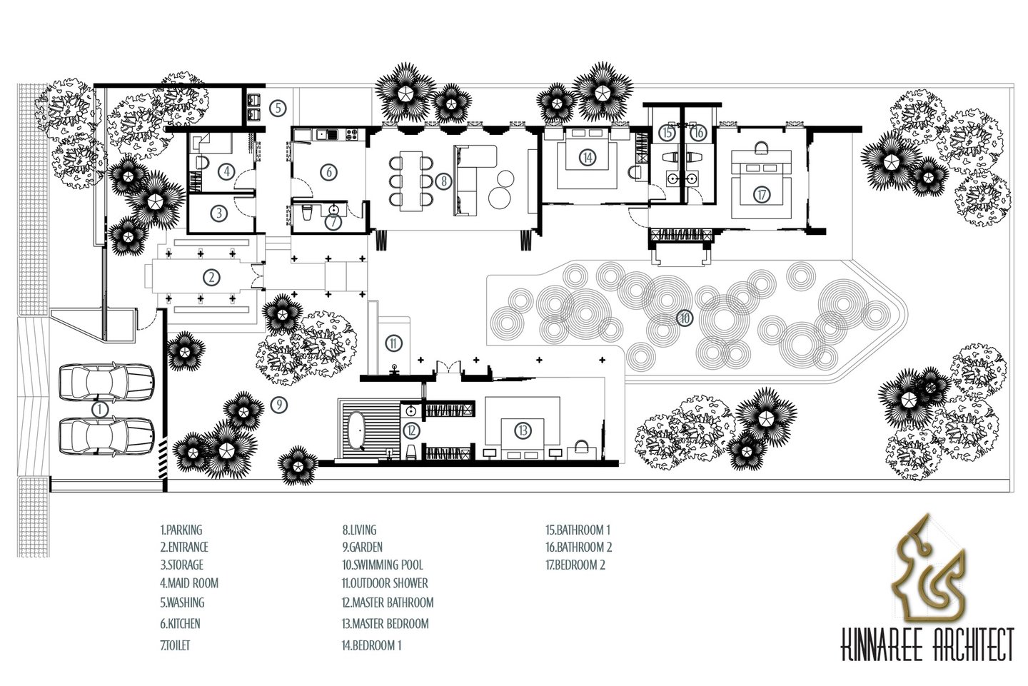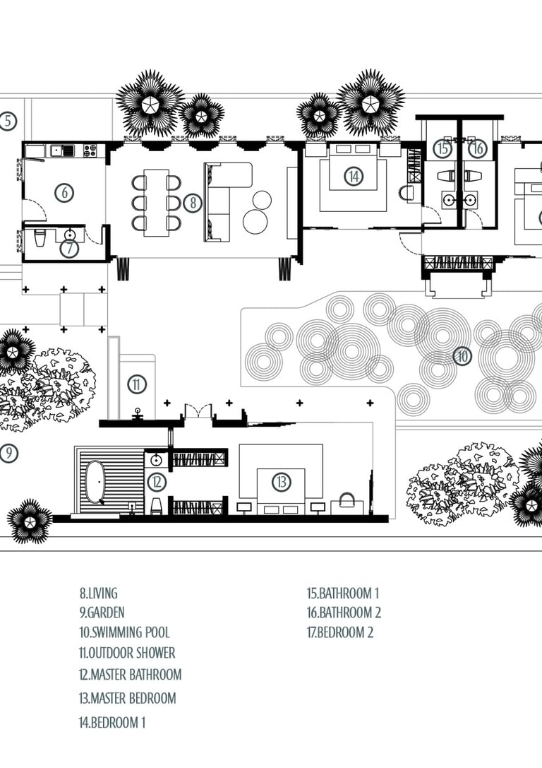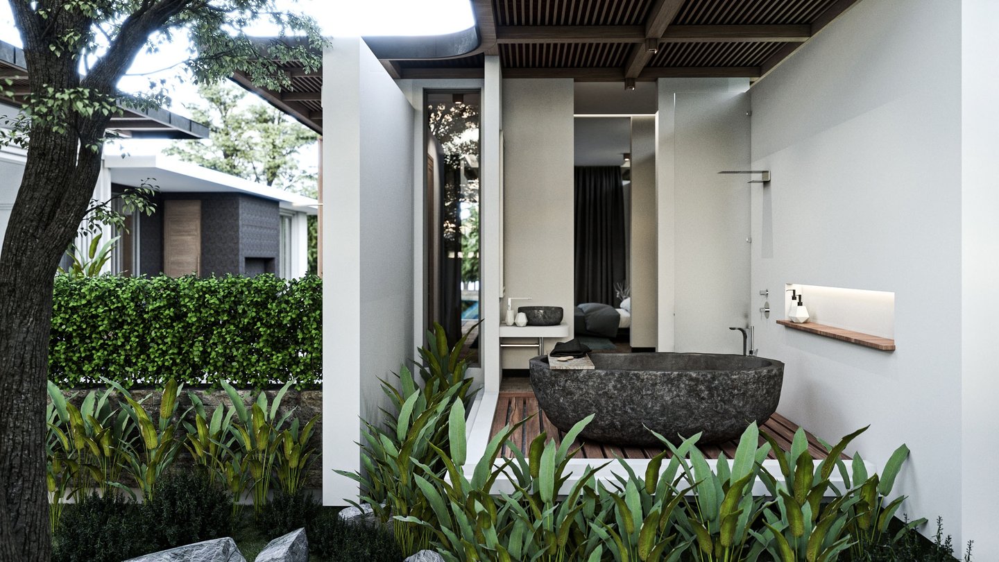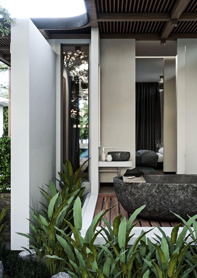 This house is designed with an open central space, allowing the structure to remain thin and well-ventilated. The middle area, a private retreat, is flanked by open spaces, and the extended eaves provide excellent protection from sun and rain. The design features a personal touch, blending modern tropical elements with the warmth of wood and a clean, refreshing aesthetic.