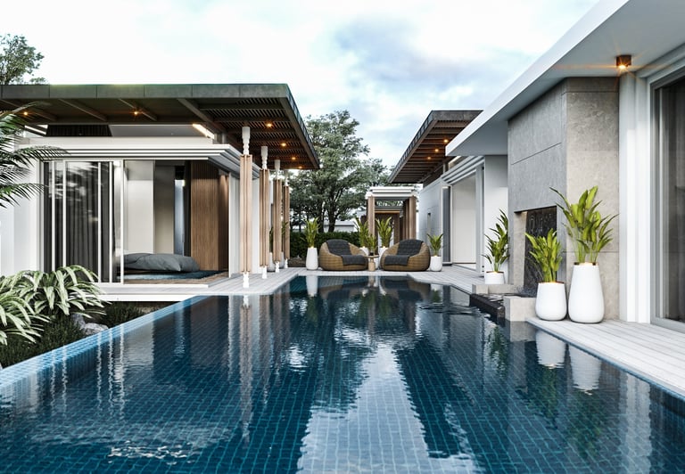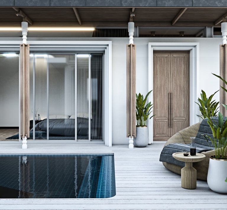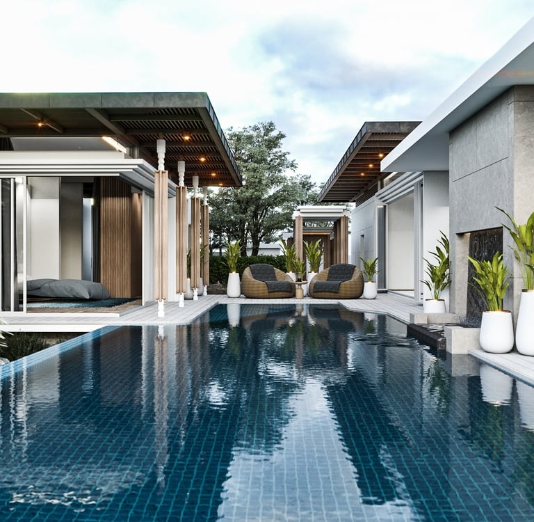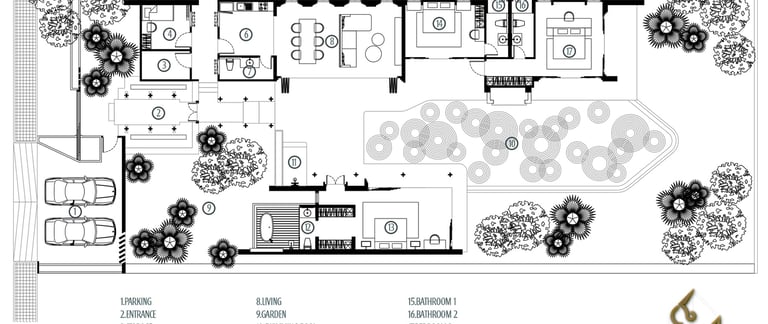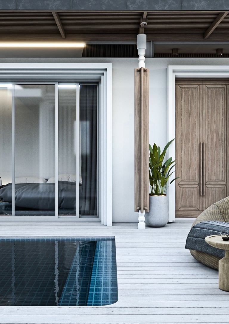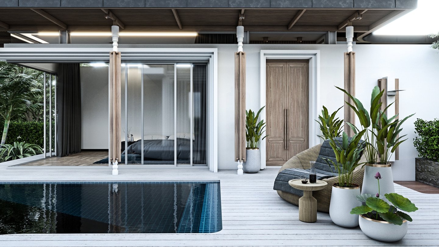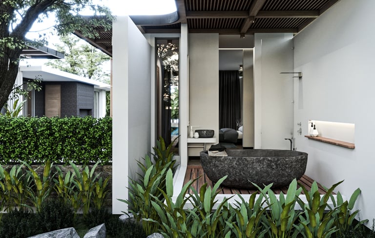 This house is designed with an open central space, allowing the structure to remain thin and well-ventilated. The middle area, a private retreat, is flanked by open spaces, and the extended eaves provide excellent protection from sun and rain. The design features a personal touch, blending modern tropical elements with the warmth of wood and a clean, refreshing aesthetic.