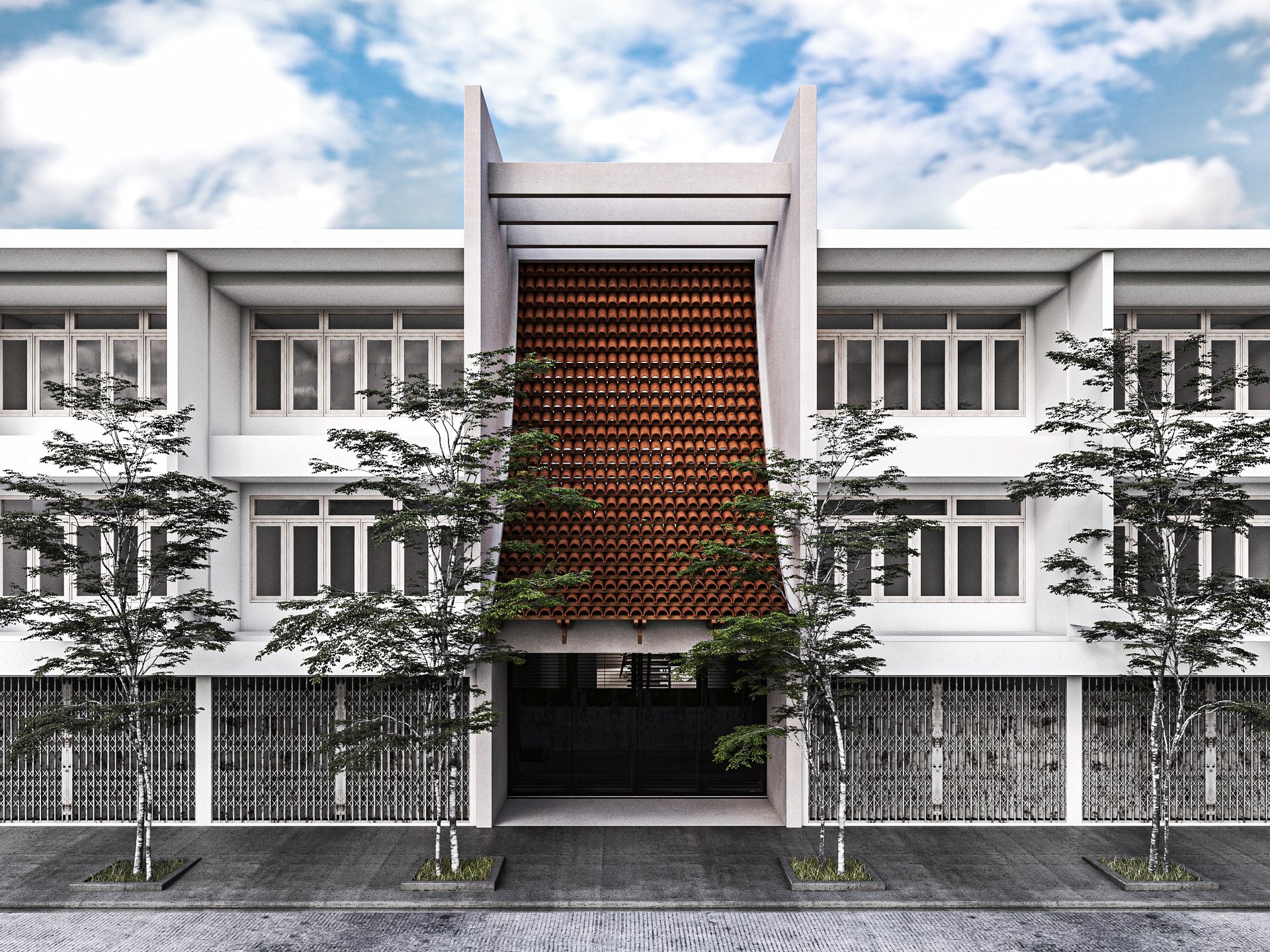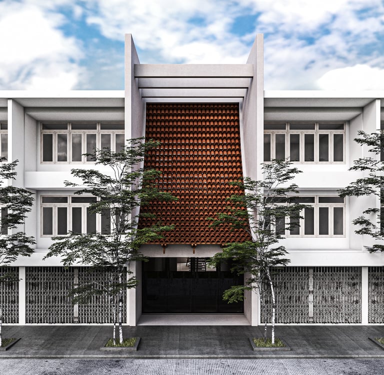 Our design concept, called "Thai Retell", reinterprets traditional Thai elements to fit the modern context. We incorporated a facade that blocks sunlight, provides privacy, and reduces noise, while still allowing airflow into the building. Local materials like terracotta tiles are used to enhance the design.