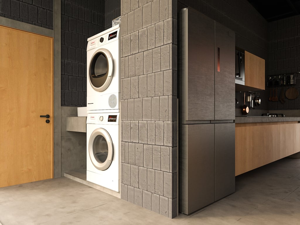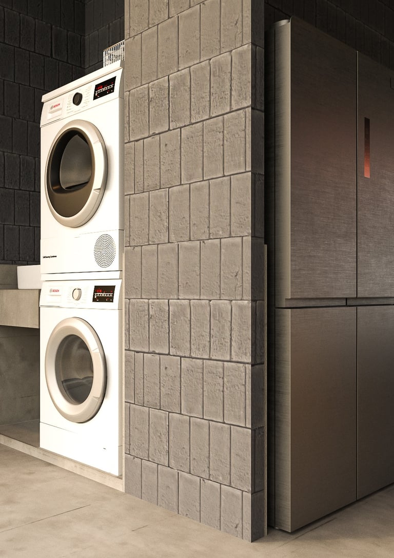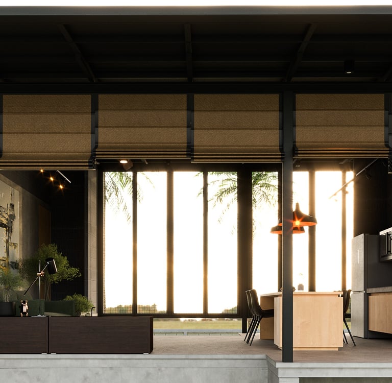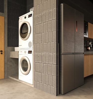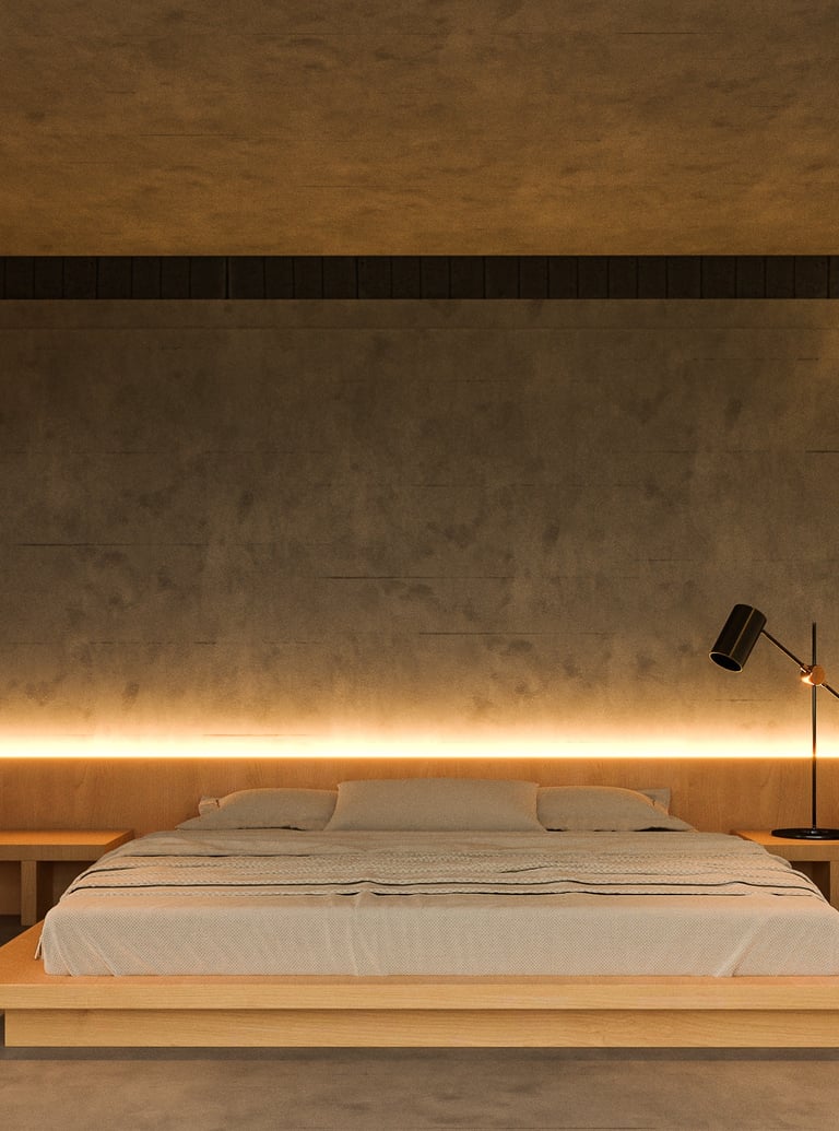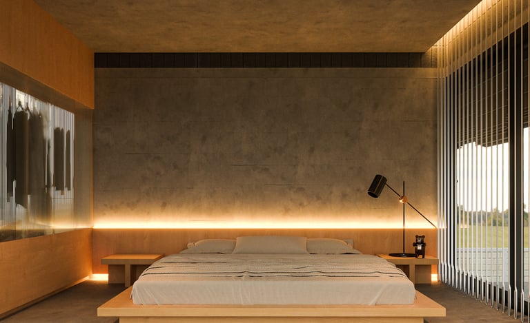 The house uses lightweight EKOBLOK bricks with low thermal conductivity, left exposed to reveal their raw beauty while reducing costs. Key spaces—bedrooms, bathrooms, and kitchen—are finished with polished plaster for easy maintenance. The 2-inch PU metal sheet roof, paired with corrugated panels, eliminates the need for a ceiling, showcasing a simple yet efficient material approach.