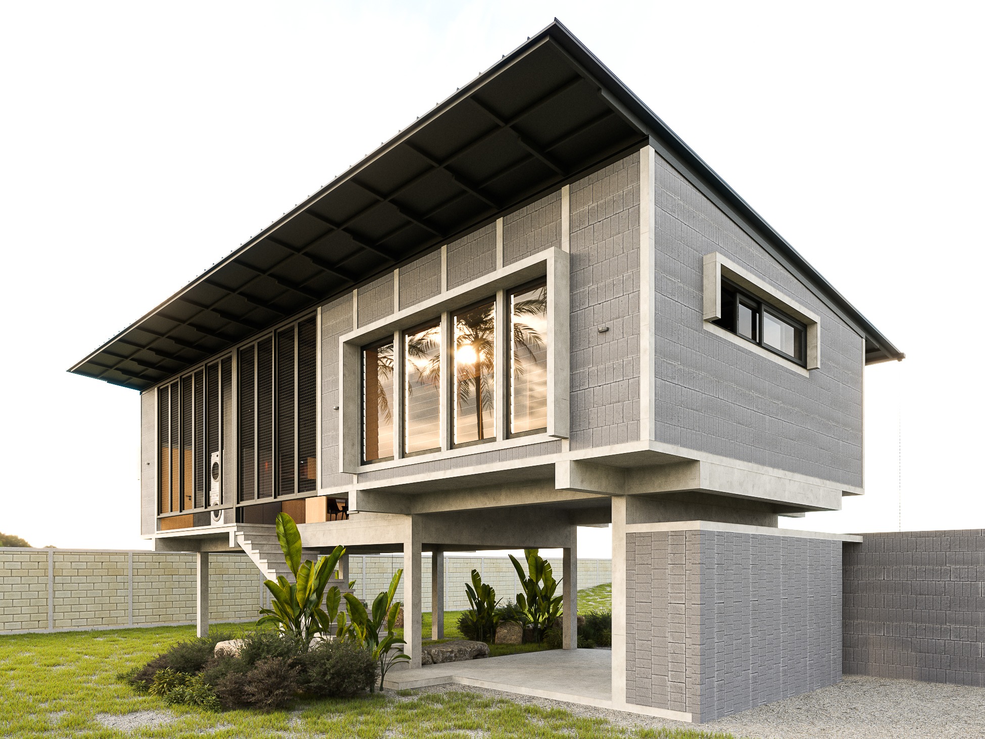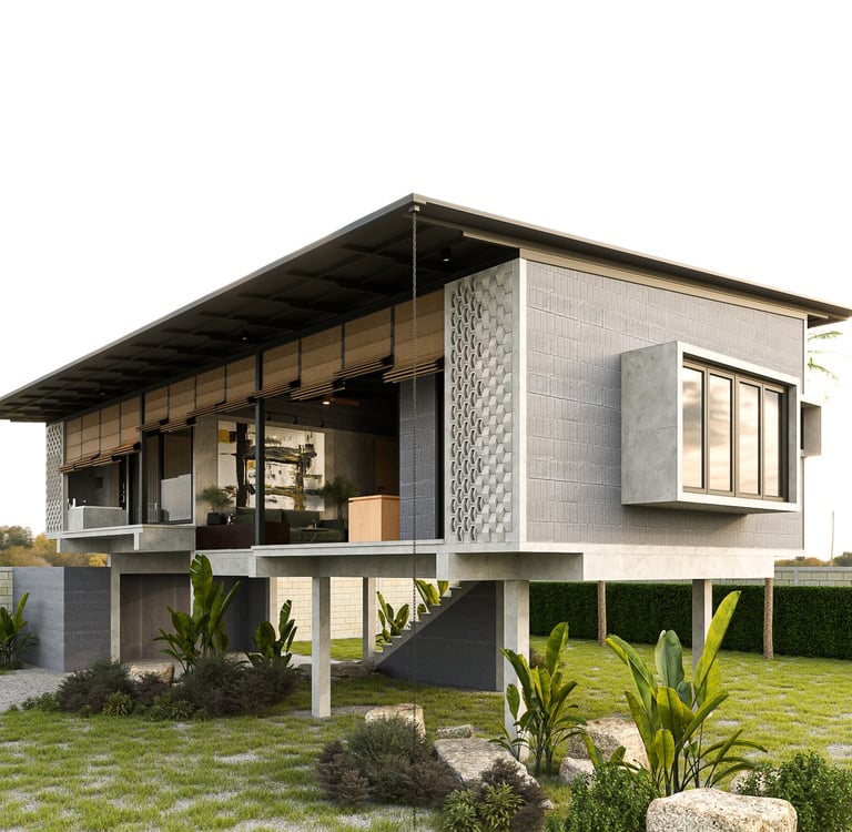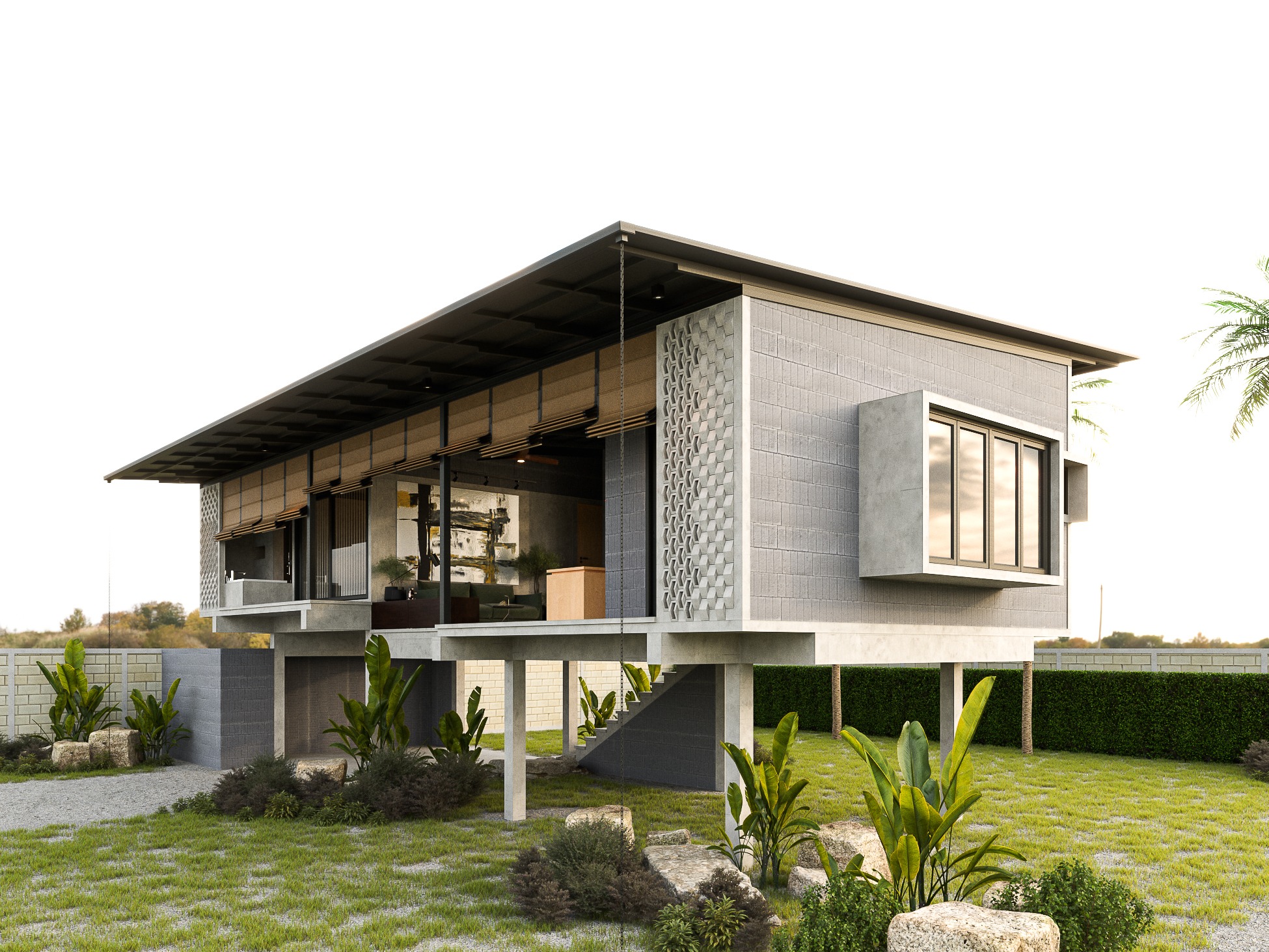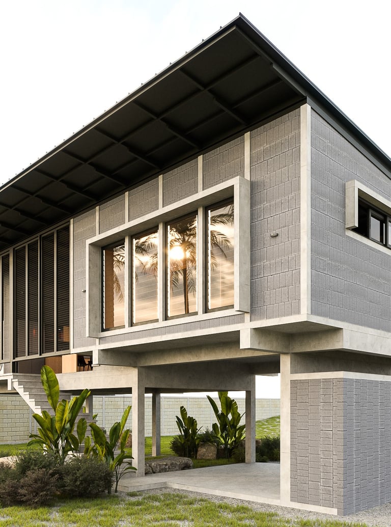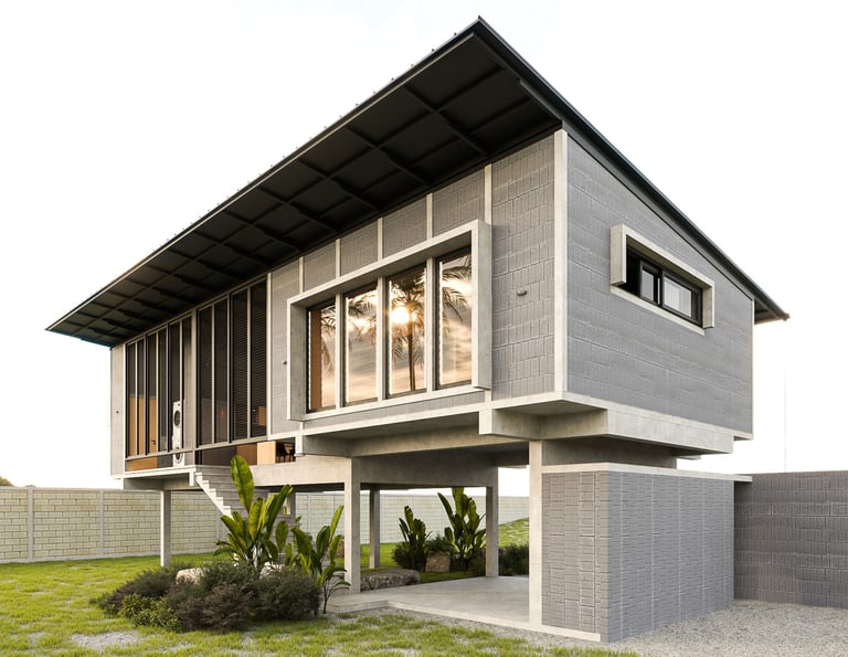 This house is thoughtfully designed to suit the tropical climate, with a layout that maximizes comfort and efficiency. The building is oriented lengthwise across the path of the sun, minimizing direct sunlight into the house. By facing the front of the house to the north, it captures breezes from both the north and south, ensuring good ventilation. The raised foundation, inspired by traditional local homes, helps the house catch cooler breezes from above, reduces heat accumulation, and prevents dust from entering.